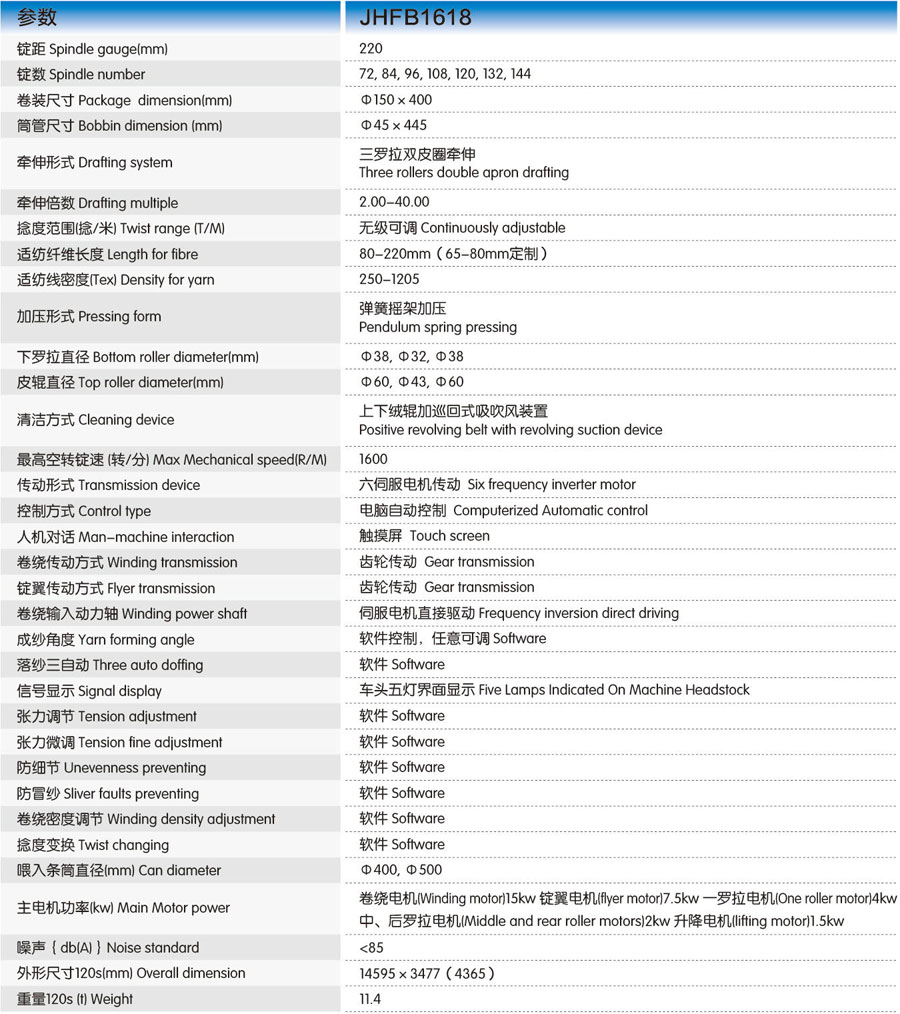 JHFB1618六轴联动全伺服毛纺电脑粗纱机,采用六伺服电机驱动,结构简单,自动化程度高,设有断电保护装置,换向迅速灵敏,克服了常用结构换向时冒纱等弊病及实现罗拉全部单独控制功能,是实用新型毛纺粗纱机。