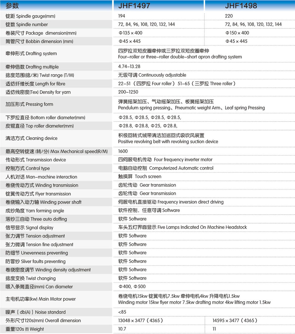 JHF1497/JHF1498全伺服电脑型粗纱机,采用先进的电脑控制技术,四伺服电机分别驱动锭翼,罗拉,卷绕,升降系统,实现了四大运动系统的同步匹配,操作简单,自动化程度高,成纱质量好,是纺制优质粗纱的选择。