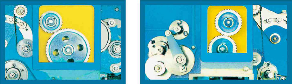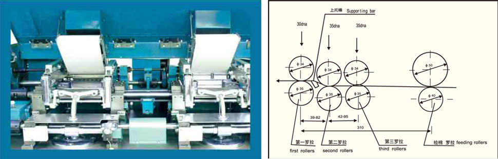 主电机采用双绕组双速电机,平皮带传给压辊,同时由同步带齿轮传动其他部分,保证传动比准确,使运转过程中平稳、噪音低。车头车尾采用油浴斜齿轮箱,牵伸采用成对交换技术,确保牵伸质量。